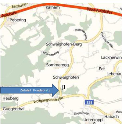 Von Eugendorf Richtung Thalgau fahren. In Reitberg rechts abbiegen Richtung Koppl – ca 200 m nach dem Schwaighofenwirt gehts links durch den Wald zum Hundeplatz. Achtung Abbiegeverbot, fahrt ein bisschen geradeaus weiter bis ihr wenden könnt…